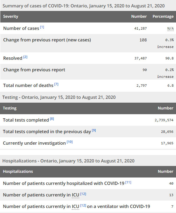 再看看安省方面的详细数据,截止8月21日,安省已对2739574例行了新冠病毒检测(检测数较昨天新增28656),还有17965处于被调查阶段。确诊总数41287(较昨天新增108,确诊率下降至0.38%),包括37487例康复(康复率仍为90.8%)、2797例死亡(截止8月22日死亡2832例,这是CBC统计的最新死亡数据,死亡人数较昨天没有增加,死亡率仍为6.9%)。住院患者40例(增加5);进入ICU患者13例(未变);IU插呼吸机患者7例(未变)。