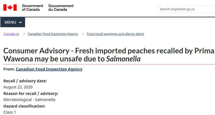—— 加拿大食品检验局(The Canadian Food Inspection Agency)在8月22日对多个品牌的新鲜桃子(包括袋装或散装售卖的黄桃、白桃、有机黄桃、有机白桃等11种)发出1级召回令,称那些桃子可能受到沙门氏菌污染,警告民众不要食用。请点击这里官方网站查询召回清单上的11种产品批号及品牌。加国生活网小编在此提醒大家,疫情情节去超市购买这些不能高温消毒的水果时一定要小心。