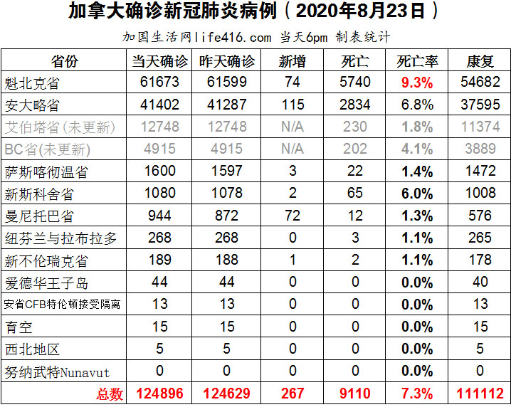 【加国生活网编译报道】截至8月23日下午6点,加拿大确诊新冠病例总数124896(当日新增267),死亡9110。魁省确诊总数61673(当日新增74);安省确诊总数41402(当日新增115);艾省和BC省又逢周末没有更新。曼省当日新增72例确诊病例,再创曼省自疫情以来的最高值;安省当日新增115例确诊病例,连续第3天超过100例;加拿大食品检验局召回多个品牌的新鲜桃子。加国生活网专门制作了如下统计数据表: