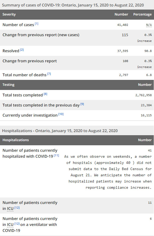再看看安省方面的详细数据,截止8月22日,安省已对2762958例行了新冠病毒检测(检测数较昨天新增23384),还有16115处于被调查阶段。确诊总数41402(较昨天新增115,确诊率上升至0.49%),包括37595例康复(康复率仍为90.8%)、2797例死亡(截止8月23日死亡2834例,这是CBC统计的最新死亡数据,死亡人数较昨天增加2例,死亡率下降至6.8%)。住院患者41例(增加1);进入ICU患者11例(减少2);IU插呼吸机患者6例(减少1)。