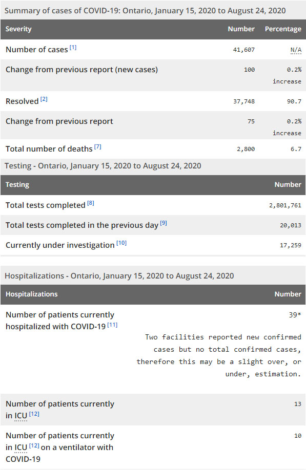 再看看安省方面的详细数据,截止8月24日,安省已对2801761例行了新冠病毒检测(检测数较昨天新增20013),还有17259处于被调查阶段。确诊总数41607(较昨天新增100,确诊率下降至0.50%),包括37748例康复(康复率下降为90.7%)、2800例死亡(截止8月25日死亡2836例,这是CBC统计的最新死亡数据,死亡人数较昨天增加2例,死亡率仍为6.8%)。住院患者39例(减少1);进入ICU患者13例(增加1);IU插呼吸机患者10例(增加3)。