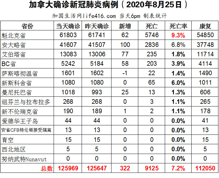 【加国生活网编译报道】截至8月25日下午6点,加拿大确诊新冠病例总数125969(当日新增322),死亡9125。安省确诊总数41607(当日新增100);艾省确诊总数13083(当日新增77);魁省确诊总数61803(当日新增62);BC省确诊总数5242(当日新增58)。安省当日新增100例确诊病例,连续第五天在100例或以上;百名魁省专家联名签署公开信敦促魁省政府重新考虑该省的学生返校计划;加拿大研究人员和公共卫生官员呼吁在学校进行新冠病毒的唾液检测。加国生活网专门制作了如下统计数据表: