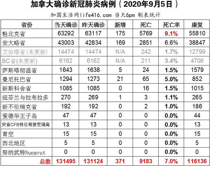 【加国生活网编译报道】截至9月5日下午6点,加拿大确诊新冠病例总数131495(当日新增371),死亡9183。魁省确诊总数63292(当日新增175);安省确诊总数43003(当日新增169,连续第十日在百例以上);艾省和BC省逢周末没有更新。加拿大首席卫生官称最近一周新冠疫情呈上升趋势;安省当日新增169例确诊病例,创自7月25日以来的最高值;魁省当日新增175例确诊病例,虽开学已一周,但卫生部长确认没有一所学校爆发疫情。加国生活网专门制作了如下统计数据表: