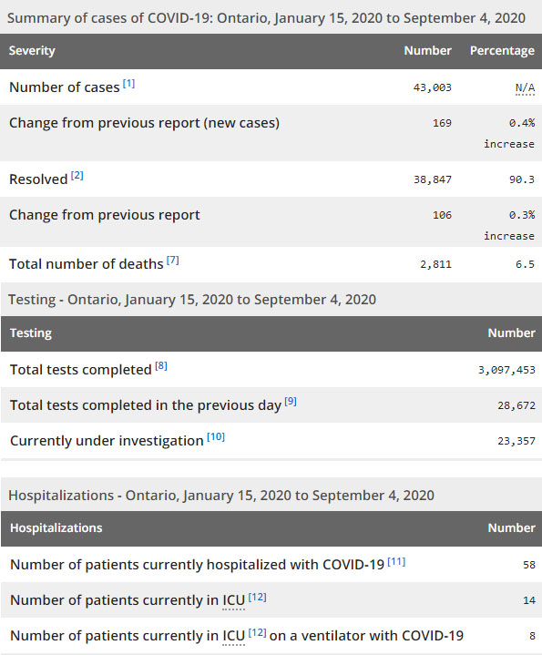 再看看安省方面的详细数据,截止9月4日,安省已对3097453例行了新冠病毒检测(检测数较昨天新增28672),还有23357处于被调查阶段。确诊总数43003(较昨天新增169,连续第10天超100例以上,确诊率上升为0.59%),包括38847例康复(康复率下降为90.3%)、2811例死亡(截止9月5日死亡2851例,这个数据是CBC新闻是基于各地公共卫生部门的数据进行统计的,该方法避免了省级报告系统的滞后时间。死亡人数较昨天未变,死亡率下降为6.6%)。住院患者58例(减少8);进入ICU患者14例(增加1);IU插呼吸机患者8例(未变)。