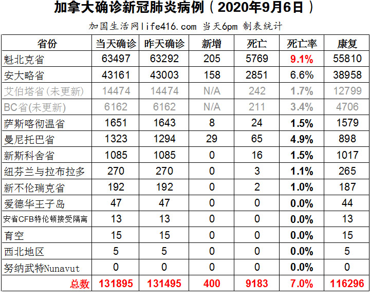 【加国生活网编译报道】截至9月6日下午6点,加拿大确诊新冠病例总数131895(当日新增400),死亡9183。魁省确诊总数63497(当日新增205);安省确诊总数43161(当日新增158,连续第11日在百例以上);艾省和BC省逢周末没有更新。安省当日新增158例确诊病例,连续第11天超过100例;多伦多和约克区公共卫生局发布消息称8月举办的宗教礼拜和大型婚礼均出现了十几例确诊病例;新冠儿童会遭到多系统炎症综合症袭击,严重的会对心脏造成损害。加国生活网专门制作了如下统计数据表: