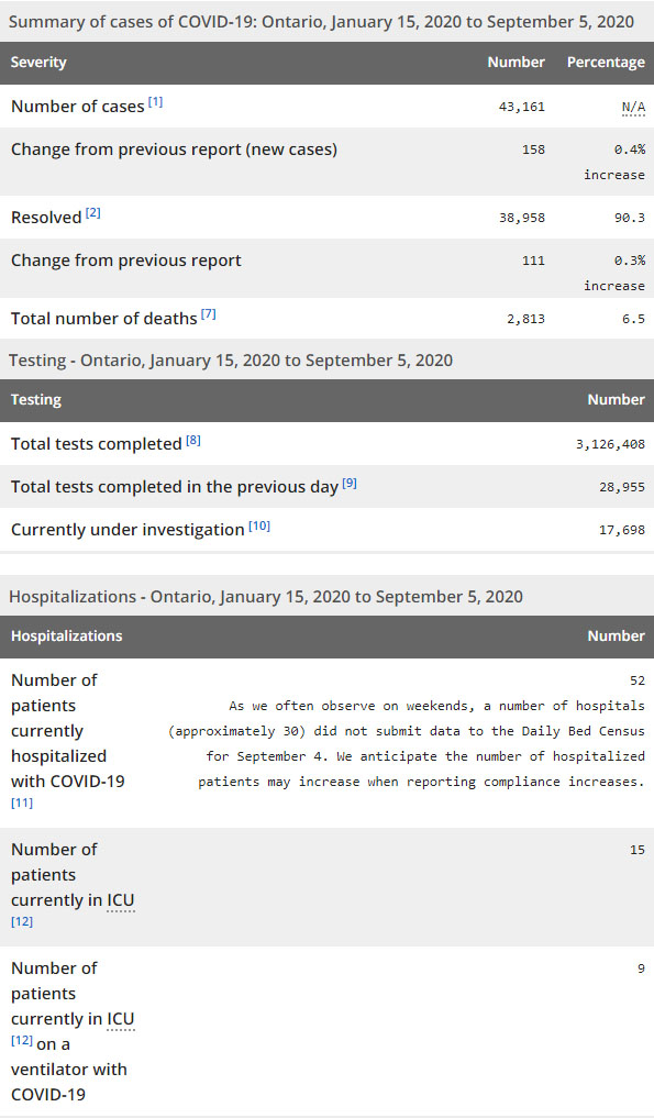 再看看安省方面的详细数据,截止9月5日,安省已对3126408例行了新冠病毒检测(检测数较昨天新增28955),还有17698处于被调查阶段。确诊总数43161(较昨天新增158,连续第11天超百例以上,确诊率下降为0.55%),包括38958例康复(康复率仍为90.3%)、2813例死亡(截止9月6日死亡2851例,这个数据是CBC新闻是基于各地公共卫生部门的数据进行统计的,该方法避免了省级报告系统的滞后时间。死亡人数较昨天未变,死亡率下降为6.6%)。住院患者52例(减少6);进入ICU患者15例(增加1);IU插呼吸机患者9例(增加1)。
