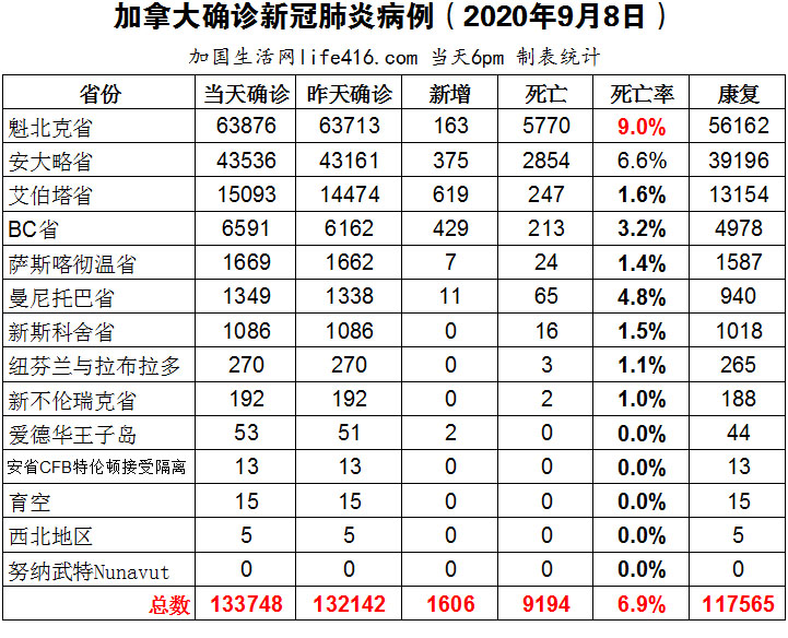 【加国生活网编译报道】截至9月8日下午6点,加拿大确诊新冠病例总数133748(当日新增1606,包括艾省和BC省四天更新总和以及安省两天更新总和),死亡9194。魁省确诊总数63876(当日新增163);安省确诊总数43536(两天共新增375);艾省确诊总数15093(四天共新增619);BC省确诊总数6591(四天共新增429)。BC省首席卫生官认为BC省可能正处于第二波疫情当中;艾省首席卫生官表示疫情攀升不会影响重返学校计划;安省将在四个星期内“暂停”进一步放松公共卫生措施。加国生活网专门制作了如下统计数据表: