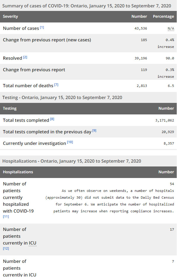 再看看安省方面的详细数据,截止9月7日,安省已对3171062例行了新冠病毒检测(检测数较昨天新增20929),还有8357处于被调查阶段。确诊总数42536(较昨天新增185,确诊率上升为0.88%),包括39196例康复(康复率下降为90%)、2813例死亡(截止9月8日死亡2854例,这个数据是CBC新闻是基于各地公共卫生部门的数据进行统计的,该方法避免了省级报告系统的滞后时间。死亡人数较昨天增加3例,死亡率下降为6.6%)。住院患者54例(减少12);进入ICU患者17例(增加4);IU插呼吸机患者7例(减少1)。