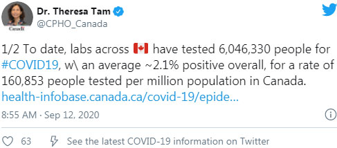 加拿大首席公共卫生官谭咏诗(Theresa Tam)博士说:“每日病例数的增加表明新冠病毒感染活动加剧,有可能会加速疫情的发生。”Tam敦促公众继续保持公共卫生习惯,将面对面的亲密接触限制在最小的范围内。Dr. Theresa Tam还在其Twitter所发布数据称,截止9月12日,加拿大共检测了6,046,330,确诊率为2.1%(世界卫生组织设定的目标是使阳性确诊率保持在5%以下)。每100万人口中共有160,853人接受测试。