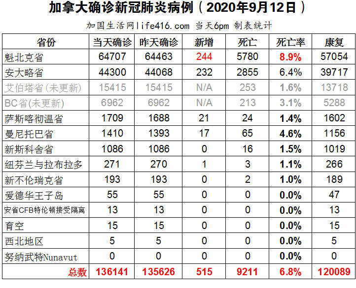 【加国生活网编译报道】截至9月12日下午6点,加拿大确诊新冠病例总数136141(当日新增515),死亡9211。魁省确诊总数64707(当日新增244);安省确诊总数44300(当日新增232);BC省和艾省逢周末未更新。加拿大过去一周每天新增确诊病例数比四周前高出65%以上,新冠阳性确诊率为2.1%;曼省在开学一周后报告2例学校确诊病例;安省万锦市一护理院宣布爆发第二次疫情;多伦多教育局鼓励尽可能多安排户外学习,多伦多一所学校开设户外教室,学生坐在枫木原木上学习。加国生活网专门制作了如下统计数据表: