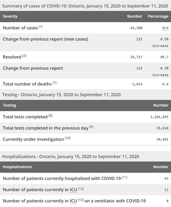 再看看安省方面的详细数据,截止9月11日,安省已对3281455例行了新冠病毒检测(检测数较昨天新增35618),还有30491处于被调查阶段。确诊总数44300(较昨天新增232,确诊率下降为0.65%),包括39717例康复(康复率下降仍为89.7%)、2814例死亡(截止9月12日死亡2855例,这个数据是CBC新闻是基于各地公共卫生部门的数据进行统计的,该方法避免了省级报告系统的滞后时间。死亡人数较昨天未变,死亡率下降为6.4%)。住院患者43例(减少6);进入ICU患者12例(减少6);IU插呼吸机患者8例(减少1)。