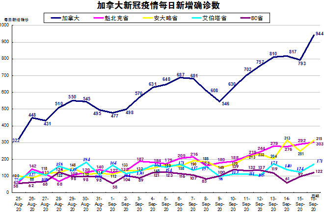 由于加拿大目前的疫情格局已经不再是魁省和安省确诊病例最多的情况了,其他几个省份也渐渐开始加重起来,“第二波”疫情已经到来,所以加国生活网小编统计了从8月25日至9月16日的四个省份的新增确诊数,并制作了如下曲线图,大家可以了解一下加拿大目前新冠疫情的发展趋势。加拿大较昨天有一些下降,当日按新增确诊数按省份排列分别是:安省新增315、魁省新增303、艾省新增171、BC省新增122、曼省新增23(低于50以下,未在下图中体现)。