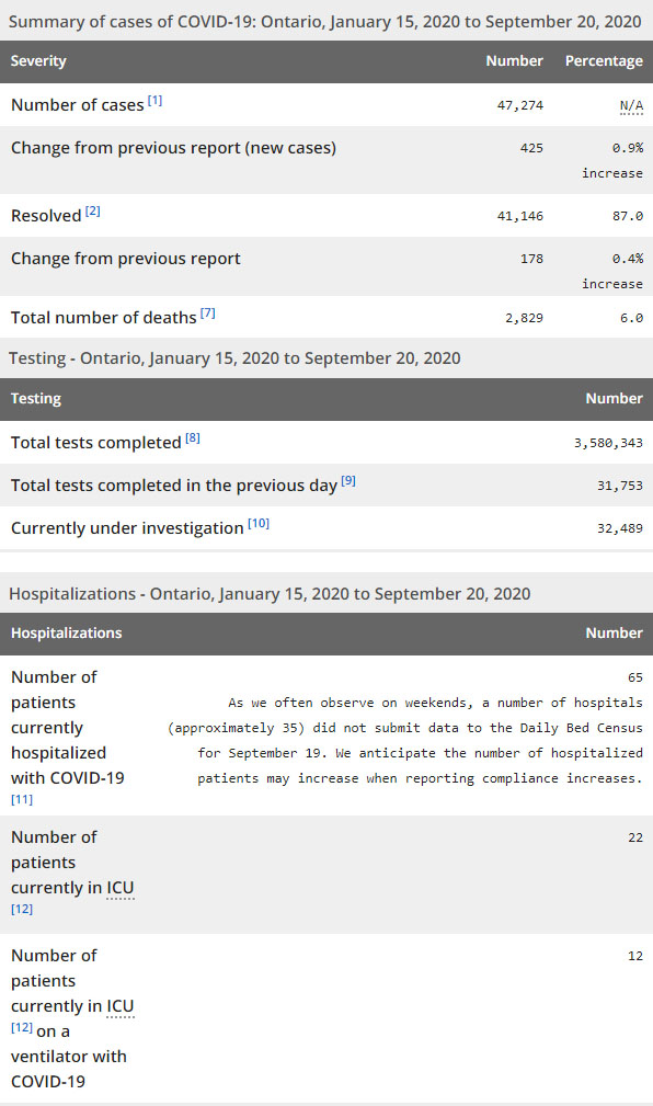再看看安省方面的详细数据,截止9月20日,安省已对3,580,343例行了新冠病毒检测(检测数较昨天新增31753),还有32489处于被调查阶段。确诊总数47274(较昨天新增425,确诊率上升为1.34%),包括41,146例康复(康复率下降仍为87%)、2829例死亡(截止9月21日死亡2869例,这个数据是CBC新闻是基于各地公共卫生部门的数据进行统计的,该方法避免了省级报告系统的滞后时间。死亡人数较昨天增加3例,死亡率仍为6.1%)。住院患者65例(增加2);进入ICU患者22例(减少1);IU插呼吸机患者12例(增加2)。