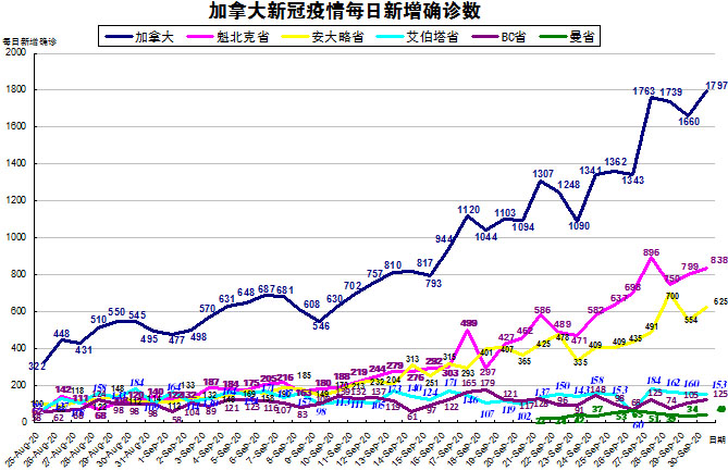 由于加拿大目前的疫情格局已经不再是魁省和安省确诊病例最多的情况了,其他几个省份也渐渐开始加重起来,“第二波”疫情已经到来,所以加国生活网小编统计了从8月25日至9月30日的五个省份的新增确诊数,并制作了如下曲线图,大家可以了解一下加拿大目前新冠疫情的发展趋势。加拿大较昨天有一些上升,从昨天的1660上升至今天的1797。当日按新增确诊数按省份排列分别是:魁省新增838、安省新增625、艾省新增153、BC省新增125、曼省新增40。