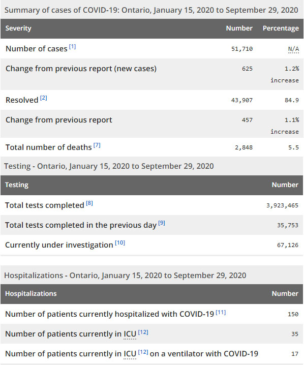 再看看安省方面的详细数据,截止9月29日,安省已对3,923,465例行了新冠病毒检测(检测数较昨天新增35,753),还有67,126处于被调查阶段。确诊总数51,710(较昨天新增625,确诊率上升为1.75%),包括43,907例康复(康复率下降为84.9%)、2,848例死亡(截止9月30日死亡2884例,这个数据是CBC新闻是基于各地公共卫生部门的数据进行统计的,该方法避免了省级报告系统的滞后时间。死亡人数较昨天未变,死亡率仍为5.6%)。住院患者150例(增加13);进入ICU患者35例(增加5);IU插呼吸机患者17例(增加1)。