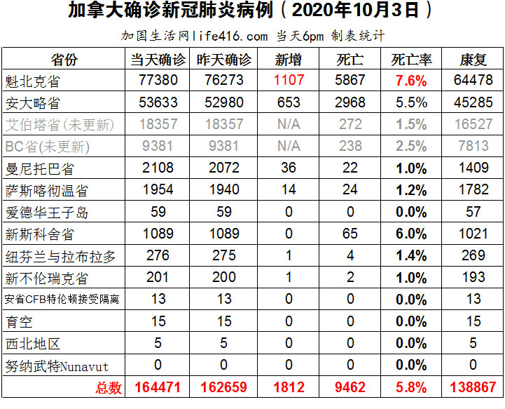 【加国生活网编译报道】截至10月3日下午6点,加拿大确诊新冠病例总数164471(当日新增1812),死亡9462(当日新增53)。魁省确诊总数77380(当日新增1107);安省确诊总数53633(当日新增653);艾省和BC逢周末未更新。为什么“第二波”新冠疫情看起来比“第一波”更危险?加拿大联邦政府在10月2日宣布将进一步加强边境的公共卫生工作并加强检疫监测。政府正引入一种支持增强家庭团聚的程序,包括针对那些具有长期专一关系、国际留学生以及同情理由入境的人士(有关国际留学生的旅行限制豁免的更新通报)。加国生活网专门制作了如下统计数据表:
