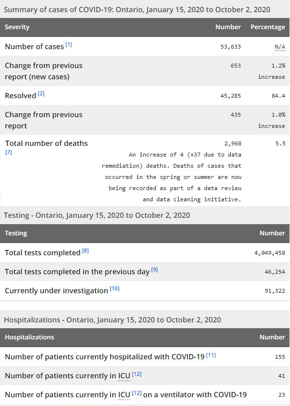 再看看安省方面的详细数据,截止10月2日,安省已对4,049,458例行了新冠病毒检测(检测数较昨天新增46,254),还有91,332处于被调查阶段。确诊总数53,633(较昨天新增653,确诊率下降为1.41%),包括45,285例康复(康复率下降为84.4%)、2,968例死亡(其中新增的37例属于春季或夏季的死亡病例,现在已作为数据审查和数据清理计划的一部分进行记录,死亡率仍为5.5%)。住院患者155例(减少12);进入ICU患者41例(增加3);IU插呼吸机患者23例(增加2)。