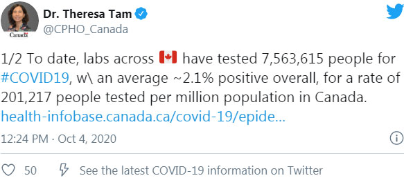 —— 加拿大首席公共卫生官谭咏诗(Theresa Tam)博士10月4日在Twitter所发布数据称,截止10月4日,加拿大共检测了7,563,615,确诊率为2.1%(世界卫生组织设定的目标是使阳性确诊率保持在5%以下),每100万人口中共有201,217人接受测试。