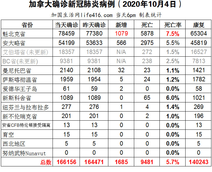 【加国生活网编译报道】截至10月4日下午6点,加拿大确诊新冠病例总数166156(当日新增1685),死亡9481(当日新增19)。魁省确诊总数78459(当日新增1079);安省确诊总数54199(当日新增566);艾省和BC逢周末未更新。截止10月4日,加拿大新冠确诊率仍为2.1%;由于安省和魁省持续报告最高每日确诊病例,加拿大已无足够时间来防止新冠疫情的大规模反扑;从10月6日起,安省新冠检测需要提前预约,无论是检测中心还是Shoppers药房均仅接受预约,想回国的华人请务必提前计算好预约时间。加国生活网专门制作了如下统计数据表:
