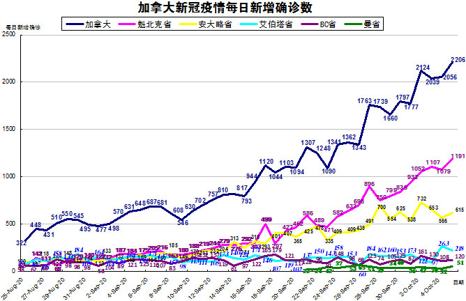 随着周末的结束,一直没有数据更新艾省和BC省终于提供新数据了,加国生活网小编将当天新增的2804例逐日进行了分解。由于加拿大目前的疫情格局已经不再是魁省和安省确诊病例最多的情况了,其他几个省份也渐渐开始加重起来,“第二波”疫情已经到来,所以加国生活网小编统计了从8月25日至10月5日的五个省份的新增确诊数,并制作了如下曲线图,大家可以了解一下加拿大目前新冠疫情的发展趋势。加拿大当日新增2206例,按新增确诊数按省份排列分别是:魁省新增1191、安省新增615、艾省新增218、BC省新增120、曼省新增51。