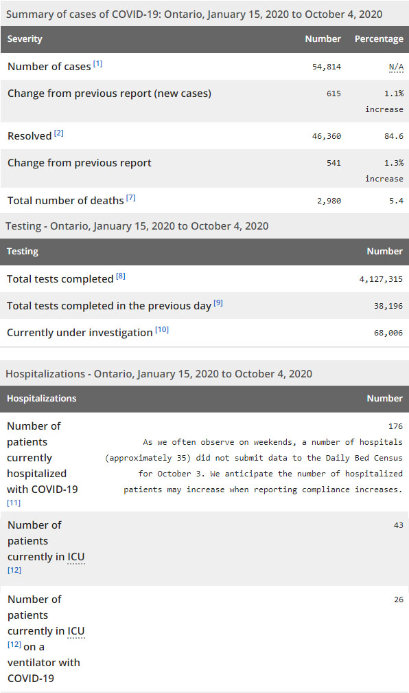 再看看安省方面的详细数据,截止10月4日,安省已对4,127,315例行了新冠病毒检测(检测数较昨天新增38,196),还有68,006处于被调查阶段。确诊总数54,814(较昨天新增615,确诊率上升为1.61%),包括46,360例康复(康复率上升为84.6%)、2,980例死亡(死亡率下降为5.4%)。住院患者176例(增加7);进入ICU患者43例(未变);IU插呼吸机患者26例(增加1)。