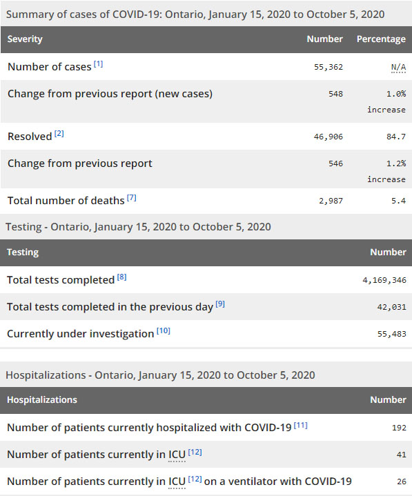 再看看安省方面的详细数据,截止10月5日,安省已对4,169,346例行了新冠病毒检测(检测数较昨天新增42,031),还有55,483处于被调查阶段。确诊总数55,362(较昨天新增548,确诊率下降为1.3%),包括46,906例康复(康复率上升为84.7%)、2,987例死亡,死亡率仍为5.4%。住院患者192例(增加16);进入ICU患者41例(未变);IU插呼吸机患者26例(未变)。