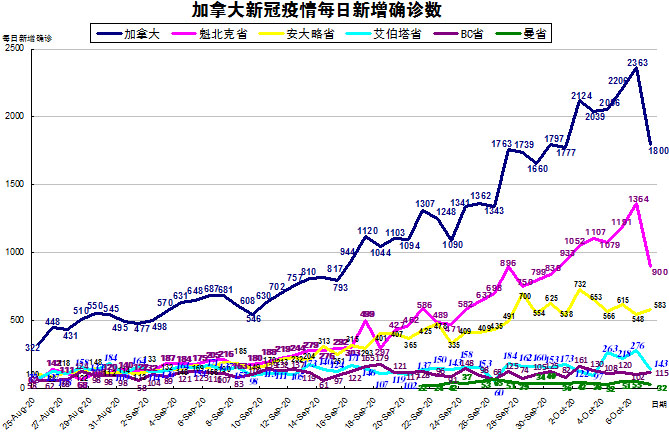 加拿大目前的疫情格局已经不再是魁省和安省确诊病例最多的情况了,其他几个省份也渐渐开始加重起来,“第二波”疫情已经到来,加国生活网小编统计了从8月25日至10月7日的五个省份的新增确诊数,并制作了如下曲线图,大家可以了解一下加拿大目前新冠疫情的发展趋势。加拿大当日新增确诊病例又有所增加,从昨天2363例下降至1800例,按新增确诊数按省份排列分别是:魁省新增900、安省新增583、艾省新增143、BC省新增115、曼省新增32。