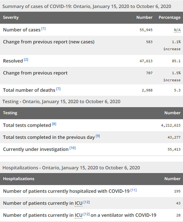 再看看安省方面的详细数据,截止10月6日,安省已对4,212,623例行了新冠病毒检测(检测数较昨天新增43,277),还有55,413处于被调查阶段。确诊总数55,945(较昨天新增583,确诊率上升为1.35%),包括47,613例康复(康复率上升为85.1%)、2,988例死亡,死亡率下降仍为5.3%。住院患者195例(增加3);进入ICU患者43例(增加2);IU插呼吸机患者28例(增加2)。