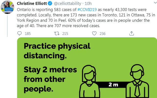 —— 安省在10月7日新增583例确诊病例,而已解决的感染病例是707例,数月来首次超过了当日新增病例数,这也算是个好消息吧。在当日新增病例中,多伦多173例、渥太华121例、约克区75例、皮尔区70例,约有60%是40岁以下的人群。在当天举行的新闻发布会上,省长福特敦促安省省民只与自己的家人度过即将到来的感恩节假期,并重申餐桌不能容纳多于10人。