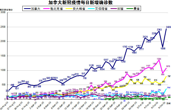 加拿大目前的疫情格局已经不再是魁省和安省确诊病例最多的情况了,其他几个省份也渐渐开始加重起来,“第二波”疫情已经到来,加国生活网小编统计了从8月25日至10月8日的五个省份的新增确诊数,并制作了如下曲线图,大家可以了解一下加拿大目前新冠疫情的发展趋势。加拿大当日新增确诊病例又大幅增加,从昨天1800例上升至2436例,按新增确诊数按省份排列分别是:魁省新增1078、安省新增797、艾省新增364、BC省新增110、曼省新增66。