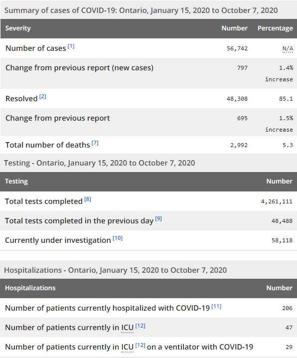 再看看安省方面的详细数据,截止10月7日,安省已对4,261,111例行了新冠病毒检测(检测数较昨天新增48,488),还有58,118处于被调查阶段。确诊总数56,742(较昨天新增797,确诊率上升为1.64%),包括48,308例康复(康复率仍为85.1%)、2,992例死亡,死亡率仍为5.3%。住院患者206例(增加11);进入ICU患者47例(增加4);IU插呼吸机患者29例(增加1)。