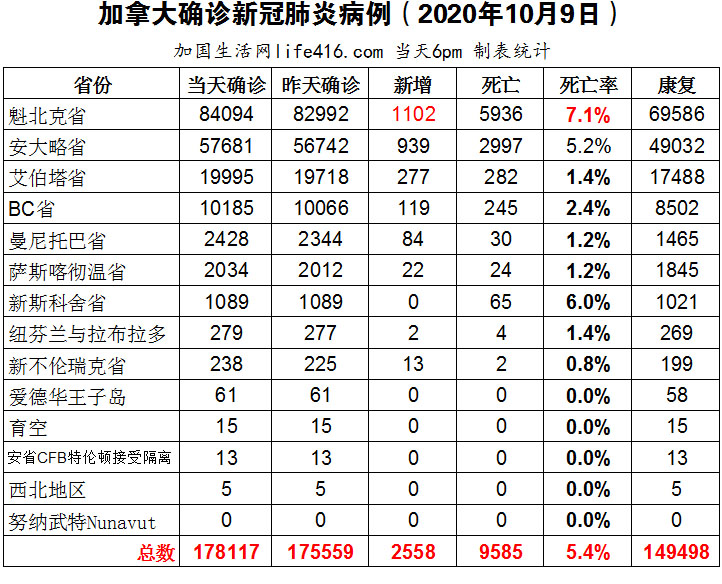 【加国生活网编译报道】截至10月9日下午6点,加拿大确诊新冠病例总数178117(当日新增2558),死亡9585。魁省确诊总数84094(当日新增1102);安省确诊总数57681(当日新增939);艾省确诊总数19995(当日新增277);BC省确诊总数10185(当日新增119)。加拿大当天新增2558例确诊病例,创自疫情以来的最高值,加拿大首席公共卫生官敦促加拿大人在感恩节长周末必须限制与别人的接触才能杜绝病毒传播的机会;安省当天新增939例确诊病例,四创自疫情开始以来的最高值。安省从10月10日起对渥太华、多伦多和皮尔区实施有针对性的第二阶段限制。加国生活网专门制作了如下统计数据表: