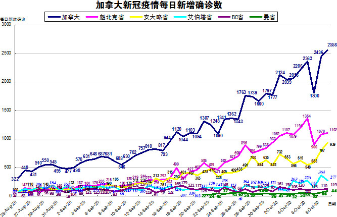 加拿大目前的疫情格局已经不再是魁省和安省确诊病例最多的情况了,其他几个省份也渐渐开始加重起来,“第二波”疫情已经到来,加国生活网小编统计了从8月25日至10月9日的五个省份的新增确诊数,并制作了如下曲线图,大家可以了解一下加拿大目前新冠疫情的发展趋势。加拿大当日新增确诊病例又大幅增加,从昨天2436例上升至2558例,按新增确诊数按省份排列分别是:魁省新增1102、安省新增939、艾省新增277、BC省新增119、曼省新增84。