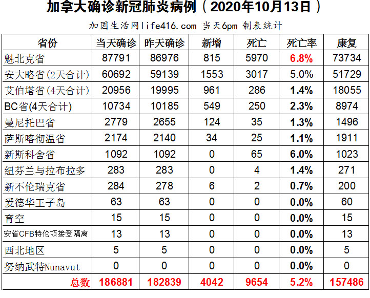 【加国生活网编译报道】截至10月13日下午6点,加拿大确诊新冠病例总数186881(感恩节长周末共新增4042,当日新增2046),死亡9654。魁省确诊总数87791(当日新增815);安省确诊总数60692(2日共新增1553);艾省确诊总数20956(4天共新增961);BC省确诊总数10734(4天共新增549)。加拿大首席公共卫生官表示,只要父母和孩子们遵守疫情期间的卫生规定,就无须取消今年的万圣节;BC省虽然在感恩节长周末共新增549例确诊病例,阳性率仍然很低约为1.39%;艾省新冠测试的未出现率渐渐升高,同时越来越多的人不愿与病毒追踪人员共享信息。加国生活网专门制作了如下统计数据表: