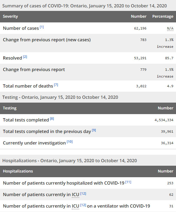 再看看安省方面的详细数据,截止10月14日,安省已对4,534,334例行了新冠病毒检测(检测数较昨天新增39,961),还有36,314处于被调查阶段。确诊总数62,196(较昨天新增783,确诊率下降为1.96%),包括53,291例康复(康复率上升为85.7%)、3022例死亡(较昨天增加5例,死亡率仍为4.9%)。住院患者253例(增加22);进入ICU患者62例(减少2);IU插呼吸机患者31例(减少4)。