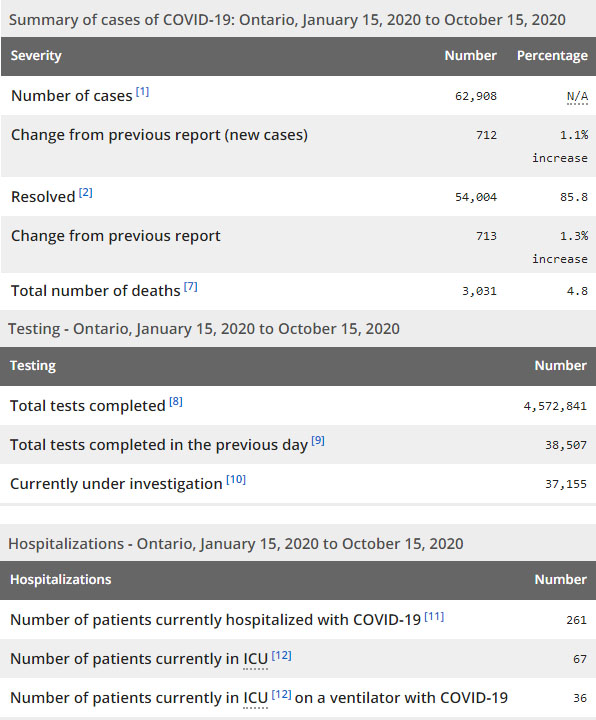 再看看安省方面的详细数据,截止10月15日,安省已对4,572,841例行了新冠病毒检测(检测数较昨天新增38,507),还有37,155处于被调查阶段。确诊总数62,908(较昨天新增712,确诊率下降为1.85%),包括54,004例康复(康复率上升为85.8%)、3031例死亡(较昨天增加9例,死亡率下降为4.8%)。住院患者261例(增加8);进入ICU患者67例(增加5);IU插呼吸机患者36例(增加5)。