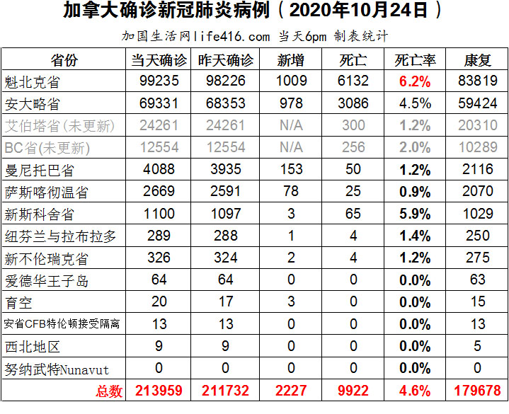 【加国生活网编译报道】截至10月24日下午6点,加拿大确诊新冠病例总数213959(当天新增2227),死亡9922。魁省确诊总数99235(当日新增1009);安省确诊总数69331(当日新增978);曼省确诊总数4088(当日新增153);萨省确诊总数2669(当天新增78);艾省和BC省逢周末未更新。加拿大首席公共卫生官表示,截止10月24日加拿大新冠确诊率为2.1%;安省新增978例确诊病例,萨省新增78例,二省均创自1月下旬疫情爆发以来单日新增病例的最高值。加国生活网专门制作了如下统计数据表: