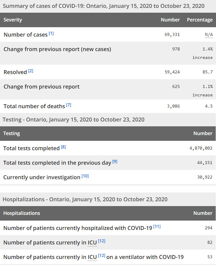 再看看安省方面的详细数据,截止10月23日,安省已对4,870,002例进行了新冠病毒检测(检测数较昨天新增44,151),还有30,922处于被调查阶段。确诊总数69,331(较昨天新增978,确诊率上升为2.22%),包括59,424例康复(康复率下降为85.7%)、3086例死亡(较昨天增加6例,死亡率仍为4.5%)。住院患者294例(增加18);进入ICU患者82例(增加4);IU插呼吸机患者53例(增加6)。