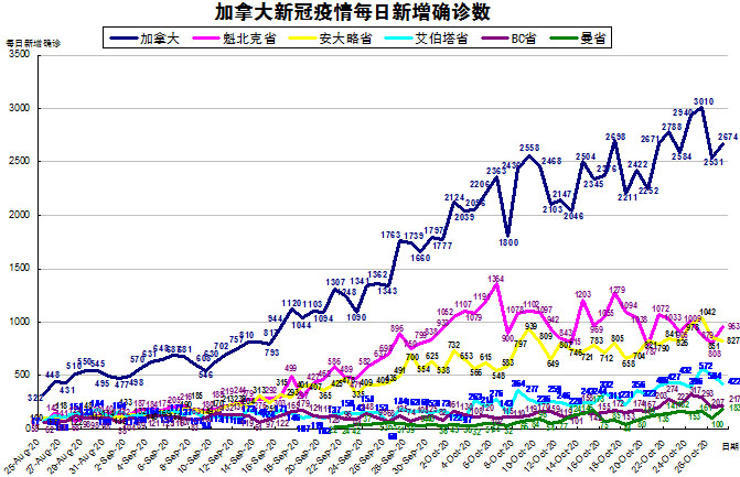 由于加拿大目前的疫情格局已经不再是魁省和安省确诊病例最多的情况了,其他几个省份也渐渐开始加重起来,“第二波”疫情已经到来,所以加国生活网小编统计了从8月25日至10月27日的五个省份的新增确诊数,并制作了如下曲线图,大家可以了解一下加拿大目前新冠疫情的发展趋势。加拿大当日新增2674例,按新增确诊数按省份排列分别是:魁省新增963、安省新增827、艾省新增422、BC省新增217、曼省新增183、萨省新增58(未超过100,未在下图中体现)。