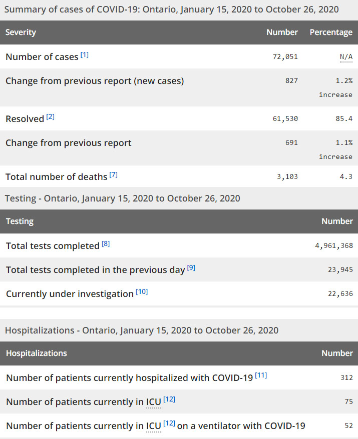 再看看安省方面的详细数据,截止10月26日,安省已对4,961,368例进行了新冠病毒检测(检测数较昨天新增23,945),还有22,636处于被调查阶段。确诊总数72,051(较昨天新增827,确诊率上升为3.45%),包括61,530例康复(康复率仍为85.4%)、3103例死亡(较昨天增加4例,死亡率下降为4.3%)。住院患者312例(增加17);进入ICU患者75例(减少3);IU插呼吸机患者52例(增加1)。