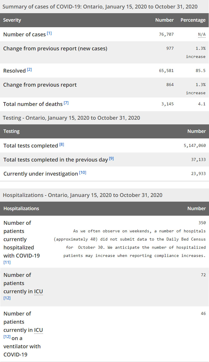 再看看安省方面的详细数据,截止10月31日,安省已对5,147,060例进行了新冠病毒检测(检测数较昨天新增37,133),还有23,933处于被调查阶段。确诊总数76,707(较昨天新增977,确诊率上升为2.63%),包括65,581例康复(康复率仍为85.5%)、3145例死亡(较昨天增加9例,死亡率仍为4.1%)。住院患者350例(增加30);进入ICU患者72例(减少1);IU插呼吸机患者46例(减少8)。