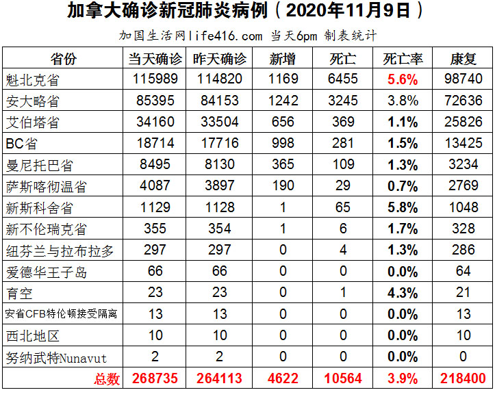 【加国生活网编译报道】截至11月9日下午6点,加拿大新冠确诊病例总数为268735(周末新增4622,当天新增4086),死亡10564(新增42)。魁省确诊总数115989(当日新增1169);安省确诊总数85395(当日新增1242);艾省确诊总数34160(当天新增656);BC省确诊总数18714(周末新增998,当天新增462);曼省确诊总数8495(当日新增365);萨省确诊总数4087(当天新增190)。辉瑞疫苗在三期临床试验中可能有90%有效性;BC省周末二天新增998例住院率再次上升;艾省住院人数破纪录;魁省卫生部敦促省民学习魁北克市抗疫经验;多伦多当天确诊病例483例再创历史新高。加国生活网专门制作了如下统计数据表: