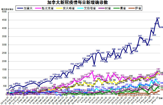 随着周末的结束,周日没有更新数据的BC省发布新数据了,加国生活网小编将当天新增的4622例进行了分解。由于加拿大目前的疫情格局已经不再是魁省和安省确诊病例最多的情况了,其他几个省份也渐渐开始加重起来,“第二波”疫情已经到来,所以加国生活网小编统计了从8月25日至11月9日的五个省份的新增确诊数,并制作了如下曲线图,大家可以了解一下加拿大目前新冠疫情的发展趋势。加拿大当日新增4086例,按新增确诊数按省份排列分别是:安省新增1242、魁省新增1169、艾省新增656、BC省新增462、曼省新增365、萨省新增190。