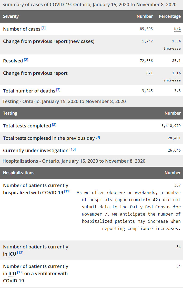 再看看安省方面的详细数据,截止11月8日,安省已对5,410,979例进行了新冠病毒检测(检测数较昨天新增28,401),还有26,646处于被调查阶段。确诊总数85,395(较昨天新增1242,确诊率上升为4.37%),包括72,636例康复(康复率下降为85.1%)、3245例死亡(较昨天增加12例,死亡率仍为3.8%)。住院患者367例(减少7);进入ICU患者84例(减少2);IU插呼吸机患者54例(增加3)。