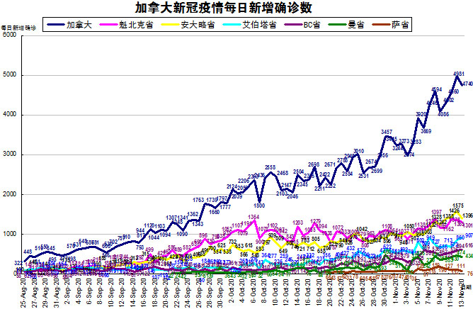 由于加拿大目前的疫情格局已经不再是魁省和安省确诊病例最多的情况了,其他几个省份也渐渐开始加重起来,“第二波”疫情已经到来,所以加国生活网小编统计了从8月25日至11月13日的五个省份的新增确诊数,并制作了如下曲线图,大家可以了解一下加拿大目前新冠疫情的发展趋势。加拿大当日新增4740例,按新增确诊数按省份排列分别是:安省新增1396、魁省新增1301、艾省新增907、BC省新增616、曼省新增434、萨省新增76。