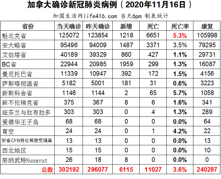 【加国生活网编译报道】截至11月16日下午6点,加拿大新冠确诊病例总数为302192(周末新增6115,当日新增4802),死亡11027(新增74)。魁省确诊总数125072(新增1218);安省确诊总数95496(新增1487);艾省确诊总数40189(新增860);BC省确诊总数22944(周末新增1959,当日新增646);曼省确诊总数11339(新增392);萨省确诊总数5182(新增181)。加拿大新冠确诊病例总数突破30万;Moderna宣布研发的新冠疫苗有效率为94.5%;BC省周末新增病例总数、艾省当天新增死亡病例数、安省每日新增病例7天平均值,均创自疫情以来最高记录;努纳武特又新增8例致使总数26例,全州将进入为期两周限制期。加国生活网专门制作了如下统计数据表: