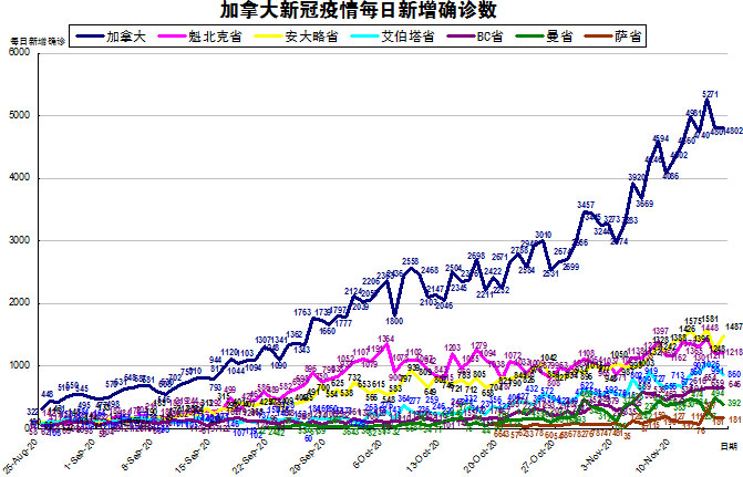 随着周末的结束,周末没有更新数据的BC省发布新数据了,加国生活网小编将当天新增的6115例进行了分解。由于加拿大目前的疫情格局已经不再是魁省和安省确诊病例最多的情况了,其他几个省份也渐渐开始加重起来,“第二波”疫情已经到来,所以加国生活网小编统计了从8月25日至11月16日的五个省份的新增确诊数,并制作了如下曲线图,大家可以了解一下加拿大目前新冠疫情的发展趋势。加拿大当日新增4802例,按新增确诊数由多至少的排列分别是:安省新增1487、魁省新增1218、艾省新增860、BC省新增646、曼省新增392、萨省新增181。