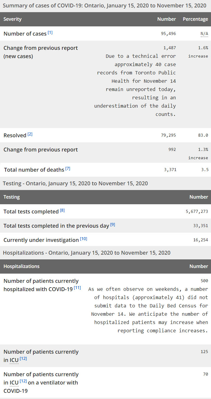 再看看安省方面的详细数据,截止11月15日,安省已对5,677,273例进行了新冠病毒检测(检测数较昨天新增33,351),还有16,254处于被调查阶段。确诊总数95,496(较昨天新增1487,确诊率上升为4.46%),包括79,295例康复(康复率仍为83%)、3371例死亡(较昨天增加10例,死亡率下降为3.5%)。住院患者500例(增加21);进入ICU患者125例(增加7);IU插呼吸机患者70例(增加3)。