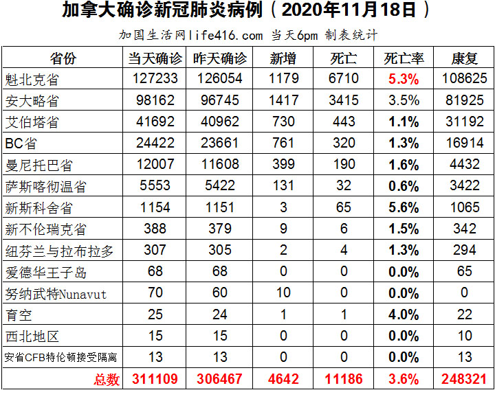 【加国生活网编译报道】截至11月18日下午6点,加拿大新冠确诊病例总数为311109(新增4642),死亡11186(新增100)。魁省确诊总数127233(新增1179);安省确诊总数98162(新增1417);艾省确诊总数41692(新增730);BC省确诊总数24422(新增761);曼省确诊总数12007(新增399);萨省确诊总数5553(新增131)。BC省将在接下来两周内禁不必要旅行;11月是艾省最严重死亡月份;安省今年不会延长学生寒假,预计明年一至三月将有240万剂新冠疫苗。加国生活网专门制作了如下统计数据表: