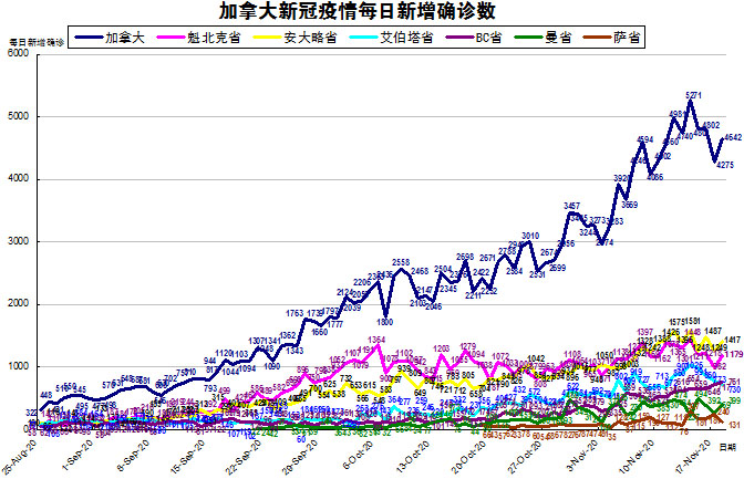 由于加拿大目前的疫情格局已经不再是魁省和安省确诊病例最多的情况了,其他几个省份也渐渐开始加重起来,“第二波”疫情已经到来,所以加国生活网小编统计了从8月25日至11月18日的五个省份的新增确诊数,并制作了如下曲线图,大家可以了解一下加拿大目前新冠疫情的发展趋势。加拿大当日新增4642例,按新增确诊数由多至少的排列分别是:安省新增1417、魁省新增1179、BC省新增761、艾省新增730、曼省新增399、萨省新增131。